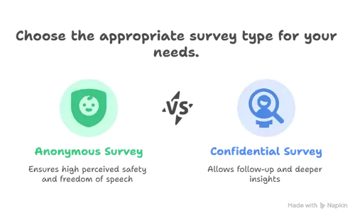 - Use anonymous when raw honesty matters more than follow-up. Use confidential when you need to reach individuals or slice data by group under strict access rules.